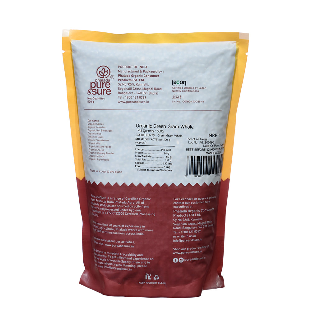 Our organic whole green gram is a rich source of iron and is perfect to meet your daily nutritional needs. A versatile and popular ingredient in the kitchen, it doubles as a vital source of protein when sprouted and consumed raw in salads. We take pride in hand picking our organic produce for 100% assured quality.