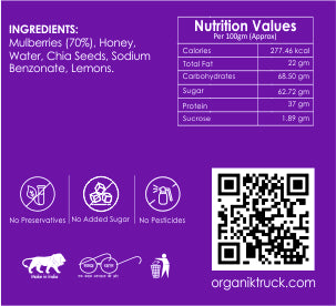 Made with a generous 70% mulberries, naturally grown on a quaint pesticide-free farm in Mahabaleshwar, this jam is bursting with real fruit flavour and health benefits. We blend in a touch of raw honey and nutrient-rich chia seeds — no refined sugar, and absolutely no chemicals.