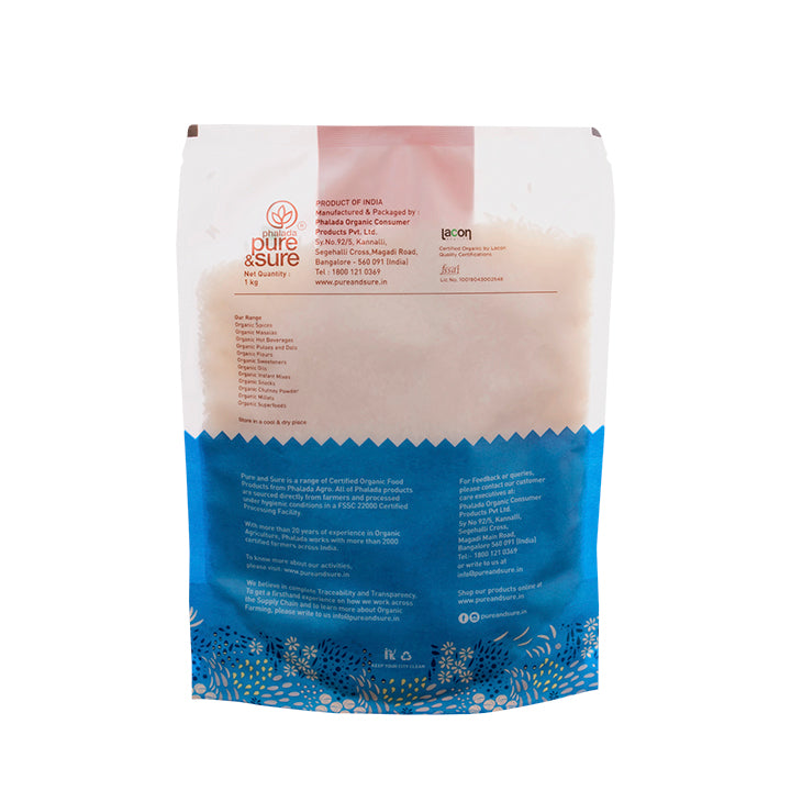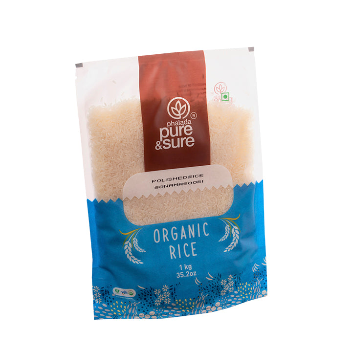 Pure and Sure’s 100% organic polished rice is cultivated with controlled organic farming practices and sourced from certified farms across India. This Sona Masoori variant has a tender texture, delicate flavor, and subtle taste, making it an ideal choice for everyday cooking.